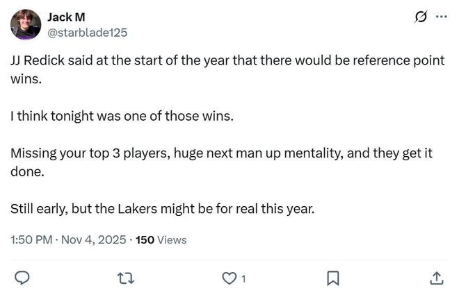 正如賽后湖人記者Jack M所說(shuō),這場(chǎng)比賽是雷迪克常說(shuō)的“標(biāo)志性”勝利,在三大主力缺席的情況下,全隊(duì)都展現(xiàn)出“下一個(gè)人頂上”的心態(tài),哪怕賽季尚早,但今年的湖人或許是來(lái)真的了。